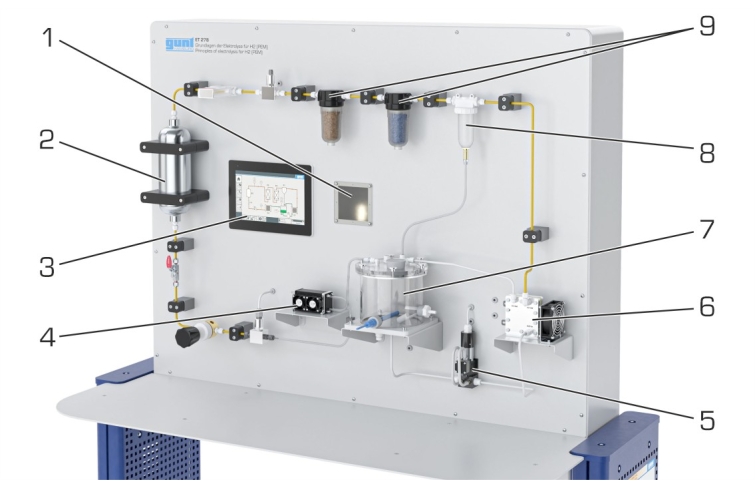 Le banc dessai ET 278 contient tous les éléments nécessaires pour étudier la conversion de lénergie électrique en hydrogène et la conversion inverse dans un circuit.